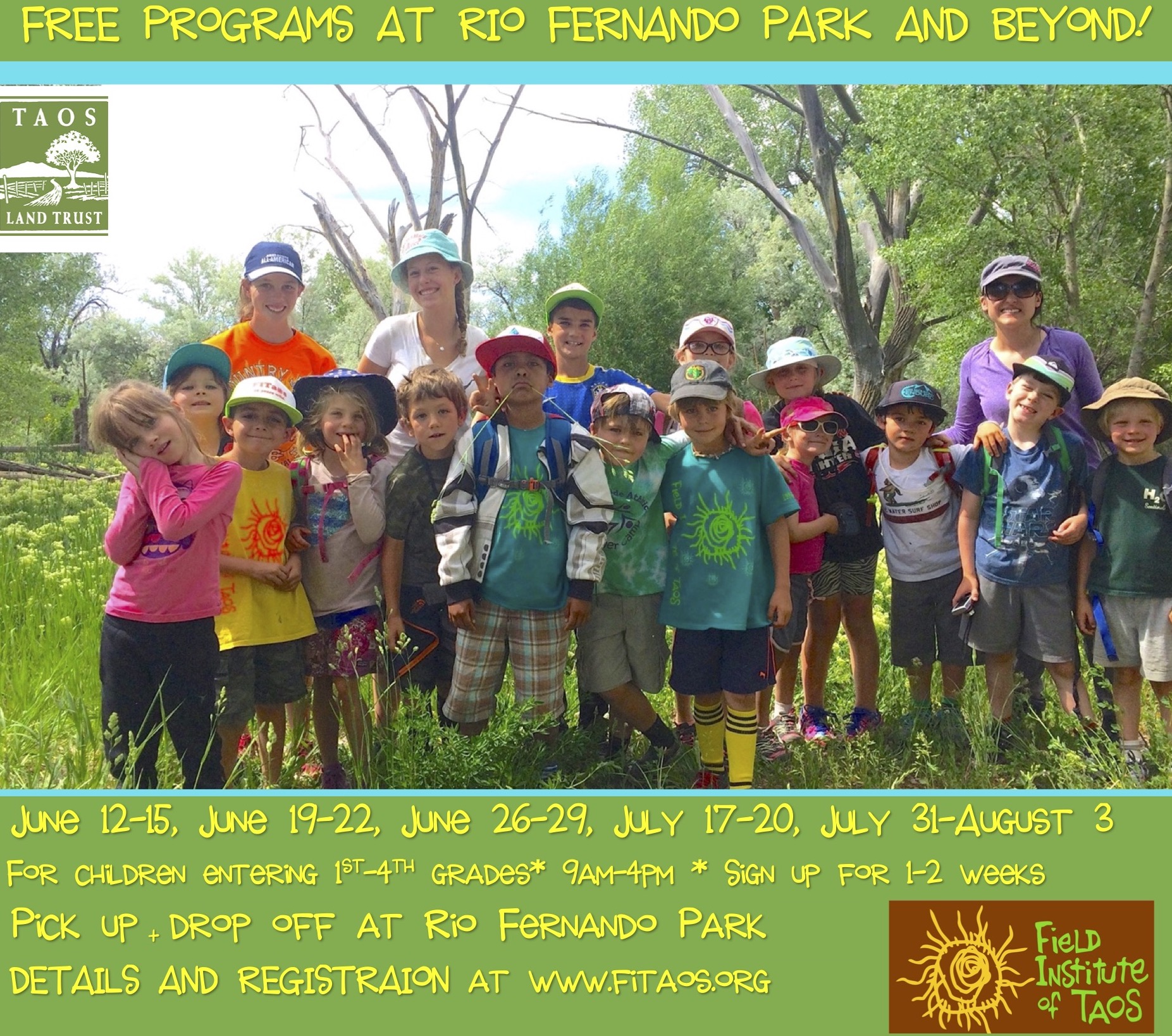 This is a special program with a goal of giving a camp experience to children who might not otherwise get to participate. Sessions are based at Rio Fernando Park in collaboration with Taos Land Trust and will go on daily field trips to nearby trails. For children entering 1st-4th grades; 4 days per week (Monday-Thursday); 9am-4pm (Please sign up for 1 or 2 weeks only). Space is limited.