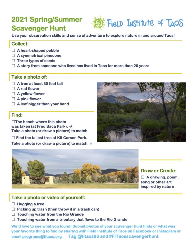 We’d love to see what you found! Submit photos of your scavenger hunt finds or what was your favorite thing to find by sharing with Field Institute of Taos on Facebook or Instagram or email programs@fitaos.org Tag @fitaos96 and #FITaosscavengerhunt